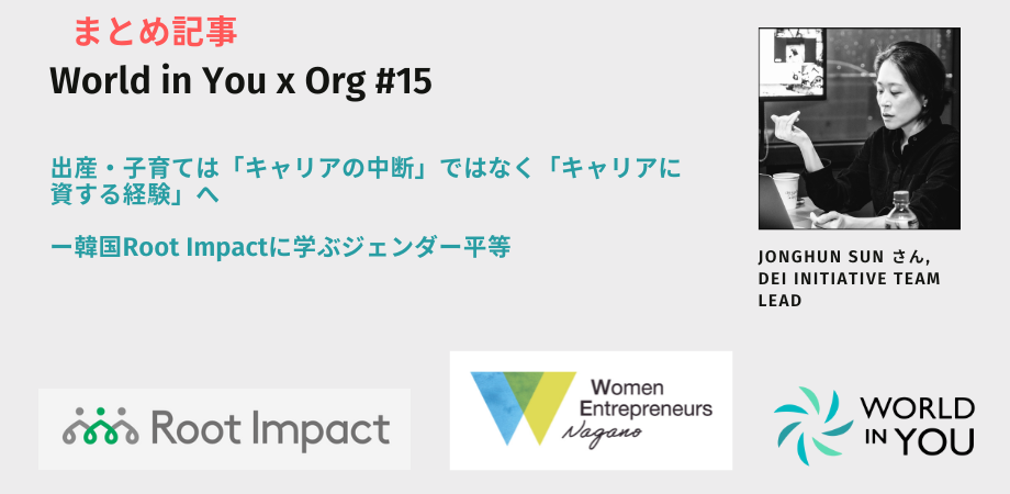 *Root Impactは、子どもを持つ女性が韓国で公的にcareer-disrupted women(キャリアが中断された女性)と呼ばれていることを批判し、それに代わるwomen with experience (経験豊かな女性)という呼称を使うことを提唱したアドボカシーも行っています。